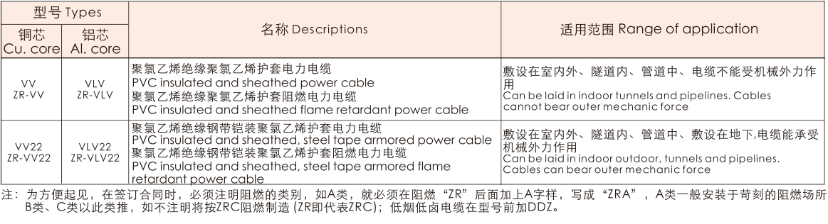 額定電壓O.6/1kV聚氯乙烯絕緣和護套(阻燃)電力電纜GB/T12706.1-2008等效采用IEC60502.2-2004,阻燃型電纜燃燒特性符合GB/T18380-2008。